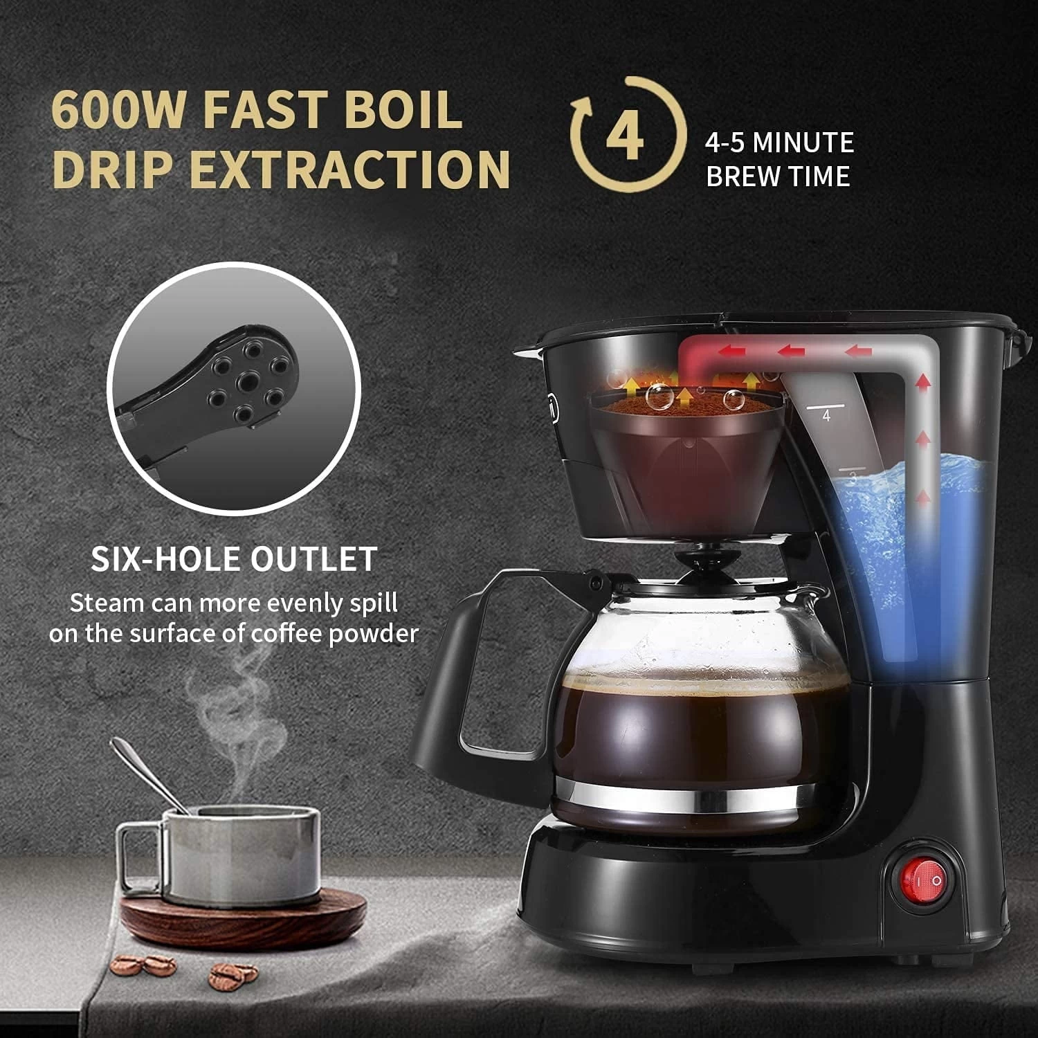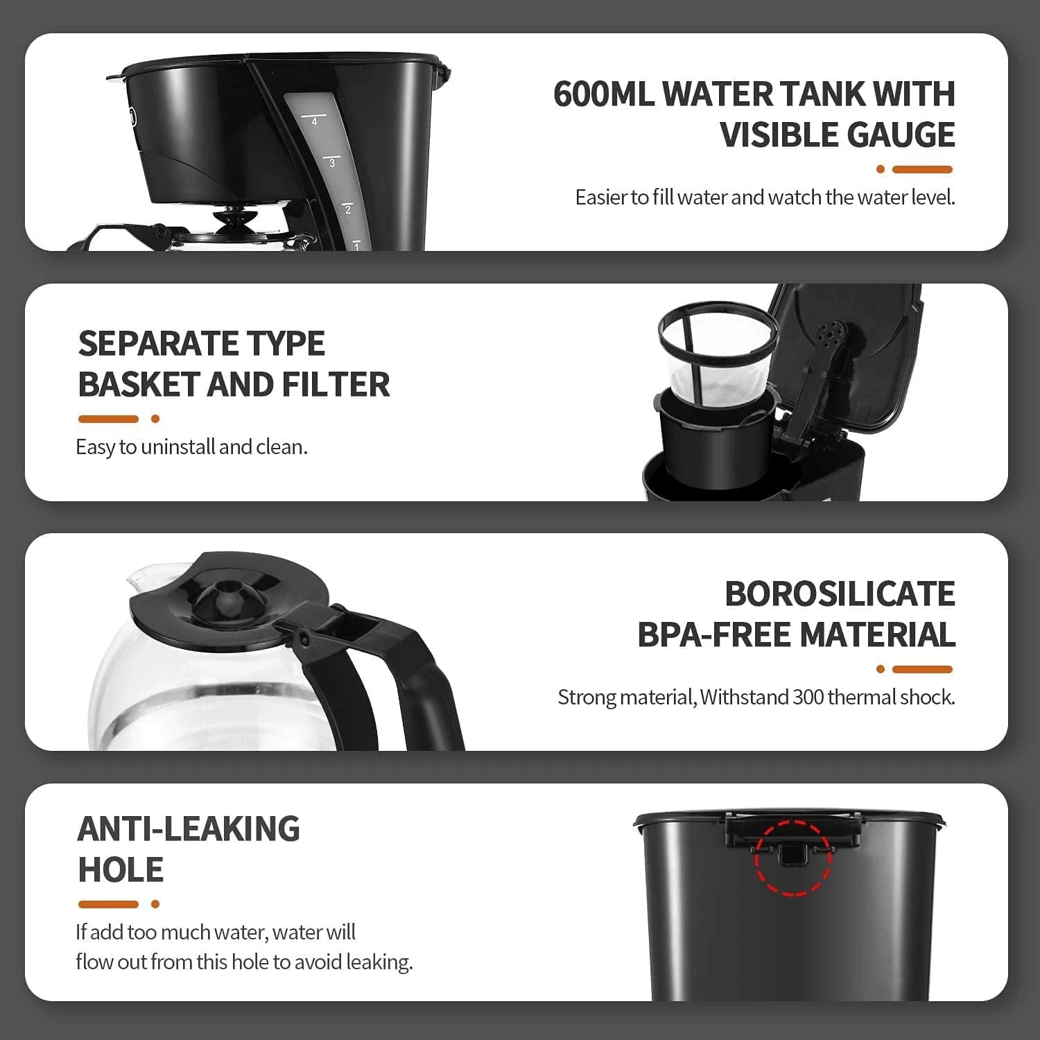 SPECIFICATIONS: One-touch control for easy operation 30s Auto Pause for Anti-Drip Keep-Warm function Boil-Dry Protection Easy-view water window Compact size with enough capacity Lighted ON/OFF switch for peace of mind Removable filter and funnel for easy cleaning