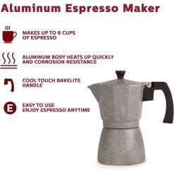 A freshly cup of coffee in the morning is minutes away with . The durable and long-lasting aluminum body heats up quickly on your stovetop and brews traditional espresso coffee. The Bakelite handle is designed for a firm grip while serving. Brew your daily pick-me-up in the comfort of your own home without spending money on store-bought coffee drinks.