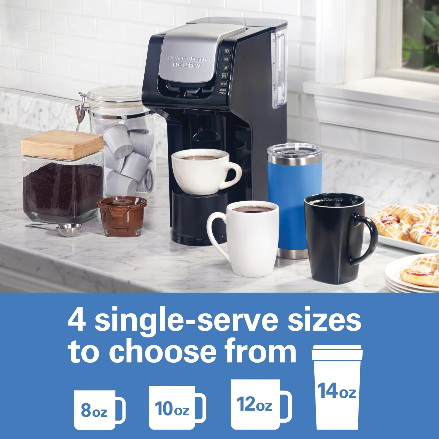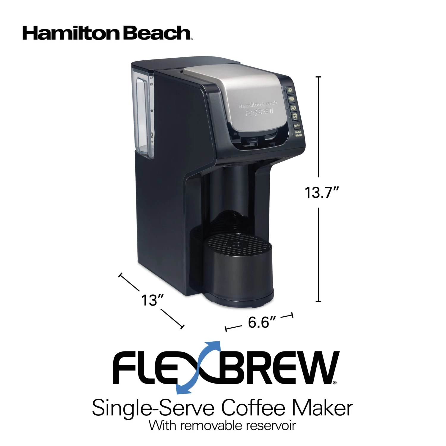 The Hamilton Beach® FlexBrew® Single-Serve Coffee Maker gives you the flexibility of brewing 2 ways — with a pod or ground coffee. You can make up to 10 oz. of coffee with your favorite brand of pod (such as a K-Cup* pod) or up to 14 oz. of coffee with coffee grounds — the choice is yours. You’ll get every cup fast because it brews an 8 oz. cup in about 90 seconds. The FlexBrew Single-Serve Coffee Maker features a removable 50 oz. water reservoir, so you can brew up to 6 servings without refilling. No matter how you brew, you can adjust the strength and amount of coffee you make with bold and regular options and multiple cup sizes. Brewing with a pod lets you make an 8 or 10 oz. cup, and brewing with coffee grounds gives you the choice of 4 brewing sizes: 8, 10, 12 or 14 oz. Includes a convenient cup rest that holds a standard-size cup and is removable to let you brew into a 7-1/2″ tall travel mug.