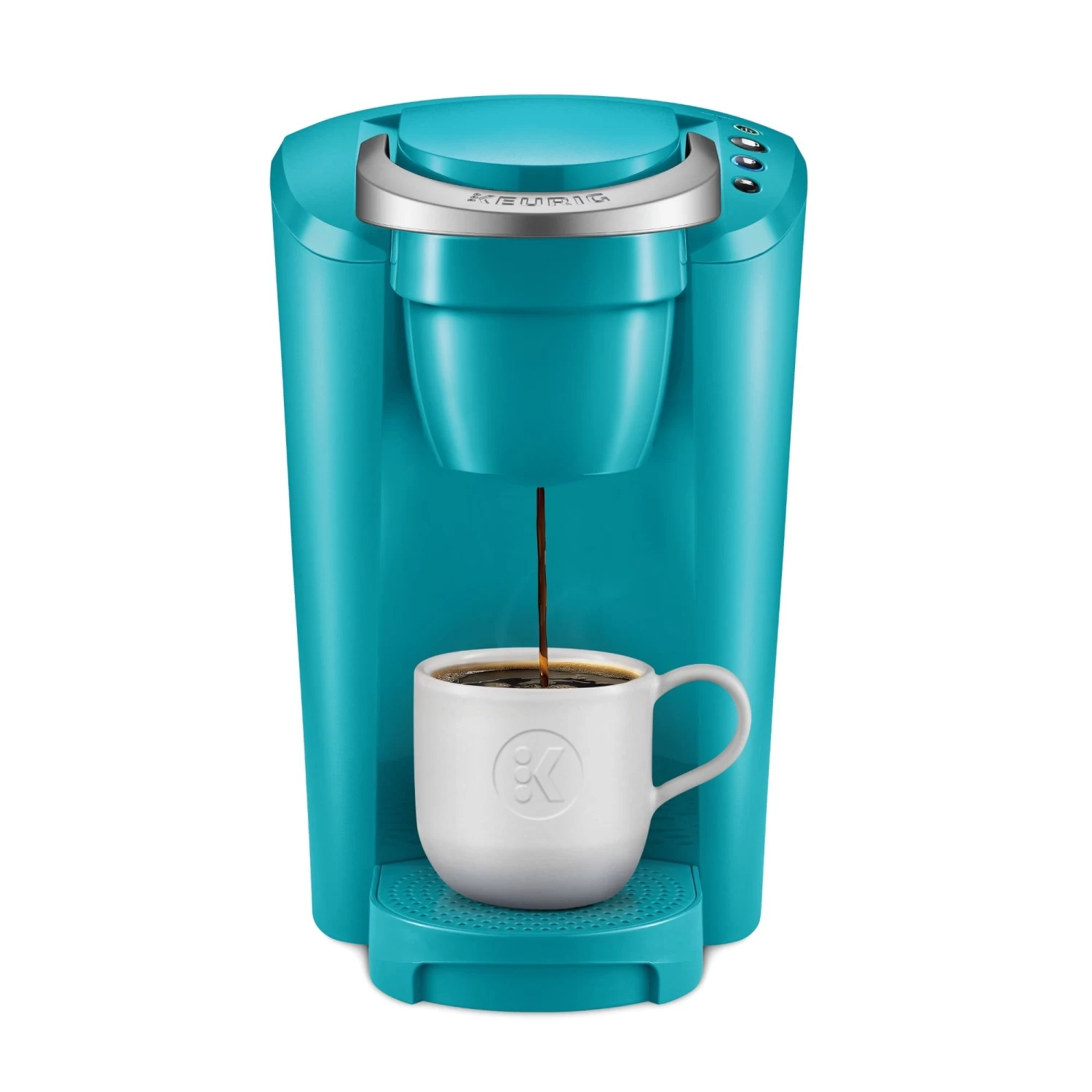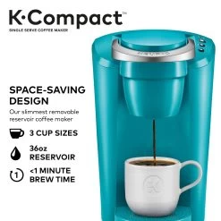 Space saving. Crowd-pleasing. The slender and stylish K-Compact single serve coffee maker offers consumers a space-saving design to fit their countertop, but still delivers the delicious taste and unparalleled convenience that the brand is known for. Designed to leave the smallest footprint possible, the K-Compact brewer in Turquoise is just over 8 inches wide, leaving you plenty of space on your countertop without sacrificing a thing. Brew 6, 8, or 10 oz. of your favorite beverages in under a minute. Choose from hundreds of delicious K-Cup pod varieties coffee, tea, hot cocoa, iced beverages, and more and enjoy a perfect cup, every time. Or brew your own ground coffee with the Universal My K-Cup Reusable Coffee Filter (not included). The Smart Start feature heats and then brews in one simple process for even more convenience. The K-Compact brewer has a removable drip tray to accommodate travel mugs, and its 36 oz. removable water reservoir allows you to brew multiple cups before refilling.