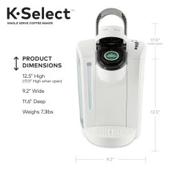 The K-Select single serve coffee maker in Matte White combines sleek design and more intuitive features to help you brew your perfect cup every single time. It features four brew sizes, so you can brew 6, 8, 10, or up to 12 oz. of your favorite coffee, tea, hot cocoa, or iced beverage with the touch of a button. And for those who like a stronger cup of coffee, the K-Select brewer is the perfect choice. The Strong Brew feature kicks up your coffee’s strength and intensity, so you can enjoy a bolder brew. Choose from hundreds of delicious varieties of K-Cup pods, or brew your own ground coffee with the My K-Cup Universal Reusable Coffee Filter (sold separately). With the K-Select brewer, you can brew 5 cups between refills of the large 52 oz. water reservoir.