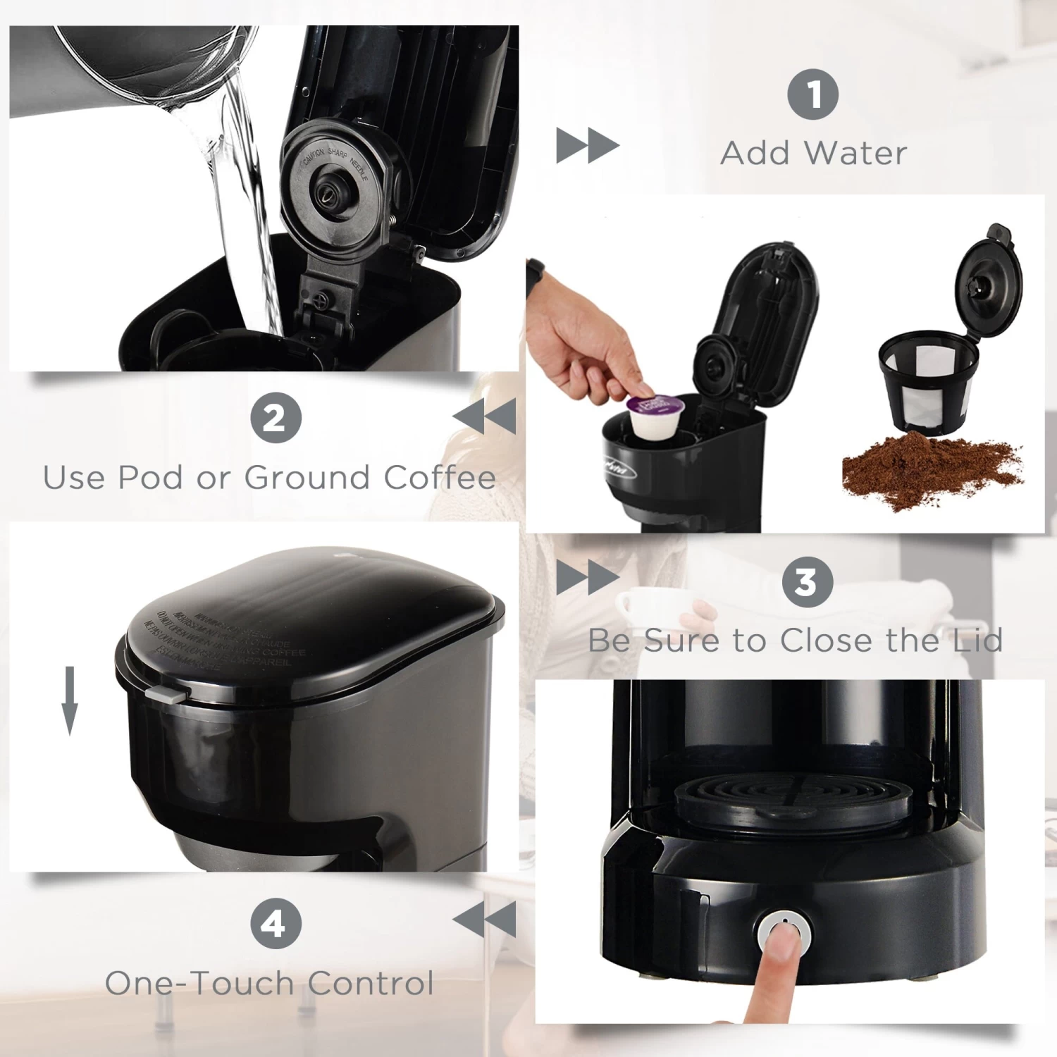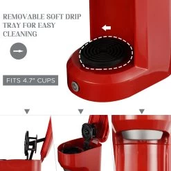 Over time, investing in a coffee machine for home use can save you money compared to buying coffee from coffee shops. In just two minutes, a steaming cup of fresh coffee is ready for you. If you like iced coffee, then all you need to do is add ice cubes to your coffee for a refreshing iced coffee! With a coffee machine at home, you can customize your coffee to your liking. You can adjust the strength, amount of milk, and sweetness of your coffee, among other factors, to suit your taste preferences.Imagine your coffee maker and breakfast machine working for you at the same time as you exercise in the morning. When you finish exercising, you can enjoy a delicious breakfast. With one touch button and light instruction, you can make a cup of coffee easily and quickly. After brewing, the Single-Serve Coffee Maker will auto shut-off, which ensure safety. Cleaning your machine have never been this easy! Detachable filter basket and drip tray can be washed directly. For cleaning, just add water and press button.