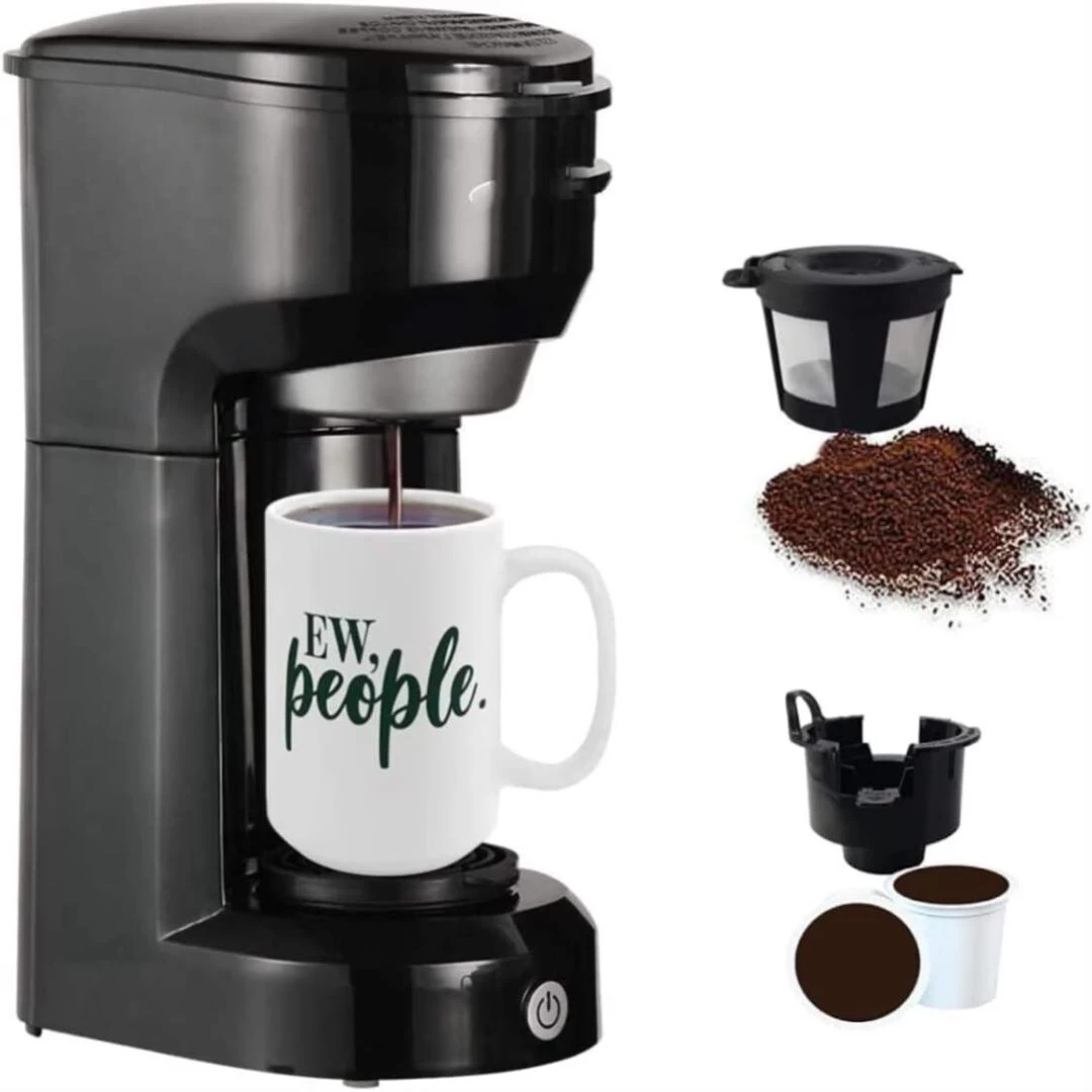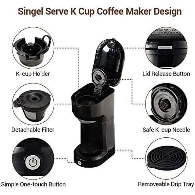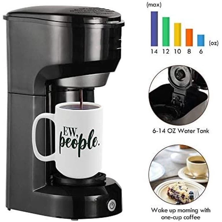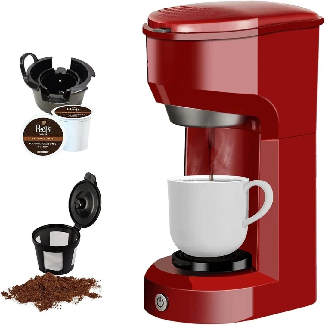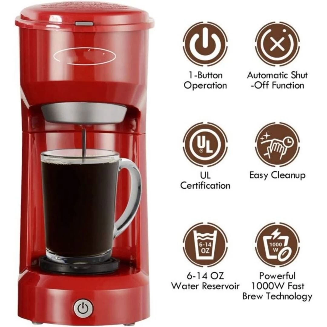 single serve coffee maker compatible with most of the k cup coffee capsule pods and is also perfect for ground coffee, a great day start with a great cup of coffee. With a 6-14oz water tank, and with a permanent filter, One-touch button makes it easy to use and brew your coffee. compact coffee maker offers three classic colorways to choose from: blue, red, and black, so no matter what scenario you want to apply, there is a style to fit your needs.